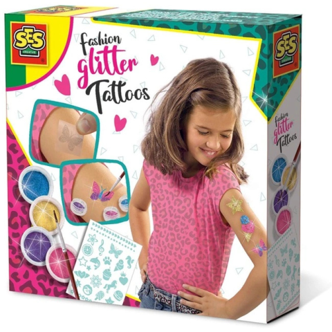 SES Divatos csillámtetoválás készlet Ajánlott 3-6 éves korig unisex [Cikkszám 65498]A SES Creative márka újabb izgalmas kreatív készletével a divatos csillámtetoválás világába léphetünk be. A kreatív készlet tartalmaz minden szükséges eszközt, hogy egyedi és csillogó tetoválásokat készíthessünk. A csomagban megtalálhatók sablonok, színes csillám és egy ecset is, amelyek segítségével bőrre ragasztható matricák készíthetők. A felhasználás folyamata