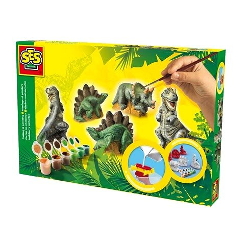 Kreatív szett - kreatív alkotáshoz, lehetővé teszi 3 gipsz dinoszaurusz megformálását, majd színezését, a készlet 3 gumidinoszaurusz formát, formatartót, gipszet, temperafestéket és ecsetet tartalmaz, 5 éves kortól A SES Gipsz dinoszaurusz trió kreatív készlet leköti a kis örökmozgókat már 5 éves kortól. Az óvodások gyakorolhatják a türelmet és fejleszthetik finommotoros készségeiket, az eredmény pedig három gyö