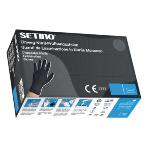 Setino Black nitril púdermentes kesztyűNitril kesztyű, amely ideális megoldást kínál azok számára, akik a természetes gumi latexre érzékenyek. Rendkívül erős kémiai ellenálló képességű és magas a tapintási érzékenységgel rendelkezik. Ideális orvosi, mind