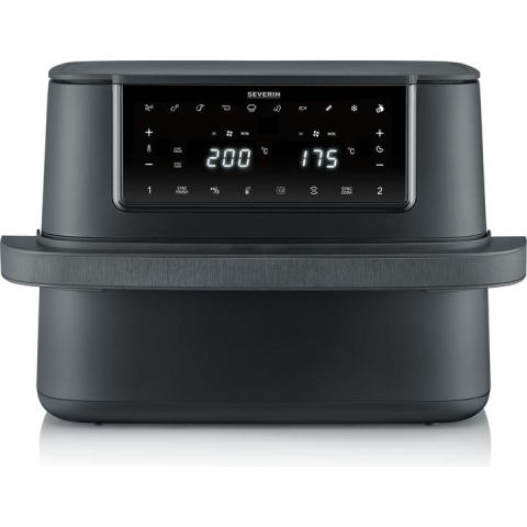Airfryer - digitális vezérlés, 60 - 200 °C között szabályozható hőmérséklet, kijelző, túlmelegedés elleni védelem, időzítő, automatikus kikapcsolás és dupla főzés, 10 program, kivehető edény, kerámia edény, 2 fritőz kosár, tömege 6,8 kg, méretei 29,8 × 34,1 × 45,3 cm (ma × szé × mé), fekete kivitel E konkrét SEVERIN Airfryer lehetővé teszi, hogy kedvenc finomságaidat minimális mennyiségű zsiradékkal készítsd el. A sütőtartály maximum 9 l olaj befo