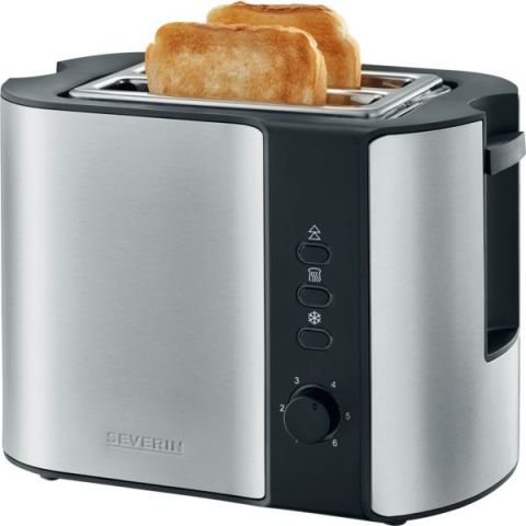 Severin kenyérpirító hőszigetelt rozsdamentes acél burkolattal. Két nyílással rendelkezik, hőérzékelős pirítással, állítható pirítási fokozattal és automatikus kikapcsolással, ha a kenyér beszorul. Morzsagyűjtővel felszerelt. Minden konyhába alkalmas.