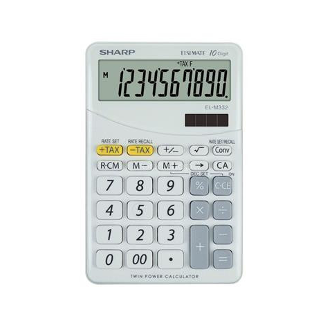 Számológép, asztali, 10 számjegy, SHARP EL-M332, fehér 10 számjegyes döntött kijelző ÁFA és valutaszámítás 00,%, +/-, › gomb méret: 100x149,1x27,2 mm elemmel (CR2032X1, tartozék) + napelemmel működik garancia: 2 év