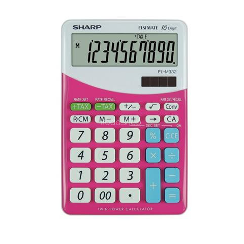 Számológép, asztali, 10 számjegy, SHARP EL-M332, pink 11 számjegyes döntött kijelző ÁFA és valutaszámítás 00 gomb, %, +/- elemmel ( tartozék ) és napelemmel működik garancia: 2 év