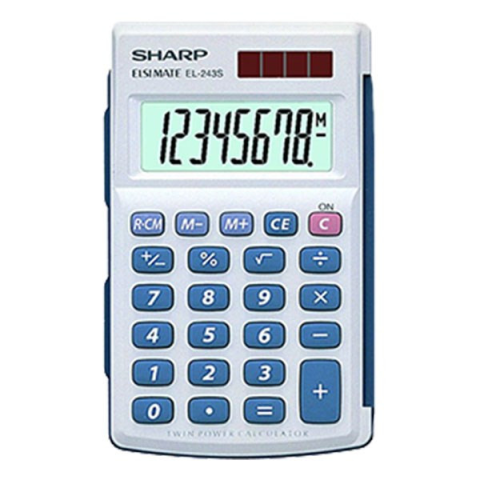 Számológép zseb SHARP EL-243S 8 digit 8-Digites nagy, döntött kijelző,Kettős energiaforrás (napelem és elem),Visszahajtható kemény tok,Százalék gomb,Gyökvonás.