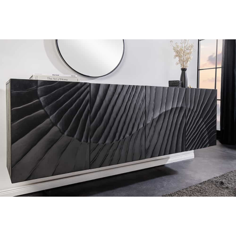Design komód Shayla 177 cm függő fekete mangó Emeld otthonod stílusát egy valóban különleges bútordarabbal! A Shayla komód nem csupán praktikus tárolóhelyet kínál, hanem igazi látványelem is. A frontját díszítő lenyűgöző 3D faragás organikus mintái szint