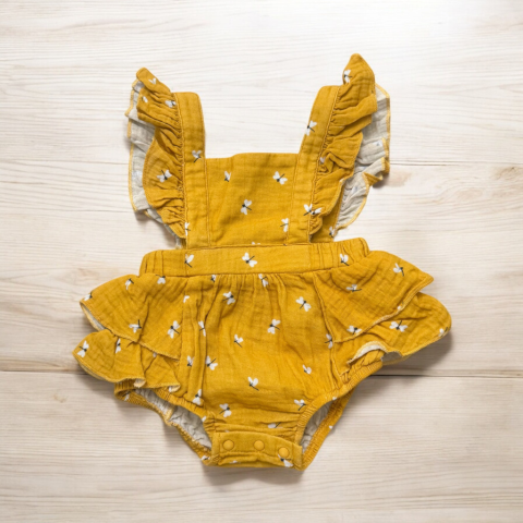 Mustársárga napozó Dereka gumis, oldala és pántja fodros, üelepnél patentos. Kellemes pamut anyag. Hibátlan állapotú.