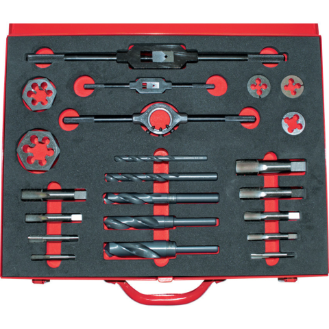 22 darabos BSPF brit csőillesztési szabvány gyorsacél menetfúró készlet célirányos tervezésű dobozban Tartalom Gyorsacél menetfúrók - ISO 529 Gyorsacél köszörült menetű egyenes hornyú anyamenetfúró 1 8 x 28 BSPF x 19 BSPF 3 8 x 19 BSPF x 14 BSPF Gyorsacél