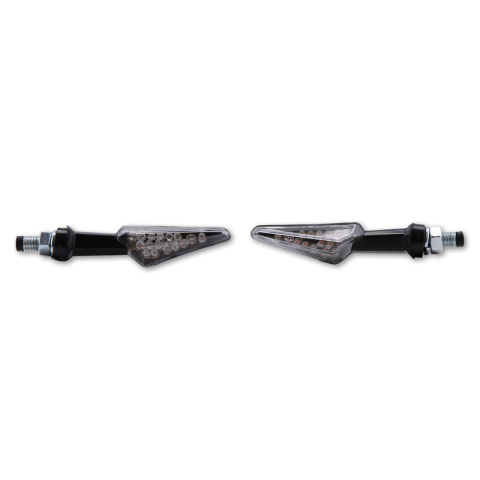 A SHIN YO LED flasher SPIKE a legújabb világítástechnológia egy erős műanyag házban fekete színben rövid fogantyúval és átlátszó üveggel, E-jelzéssel ellátva. Méretek: A: 54 mm, B: kb. 80 mm, C: 20 mm, D: 27,5 mm, Menetes csavar: M8. Műszaki adatok: Sárga kábel = irányjelző (+), Fekete kábel = földelés (-). A csomag tartalma: 1 pár.