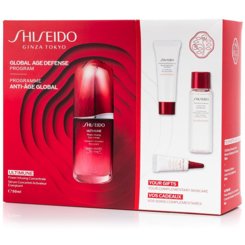 Kozmetikai ajándékcsomag - tartalma: Ultimune arcszérum 50 ml, Hidratáló és harmonizáló testápoló 30 ml, Aktív tisztító hab 15 ml, Ultimune szemenergetizáló koncentrátum minden bőrtípusra A SHISEIDO Ultimune Value Set kozmetikai ajándékcsomag teljes körű bőrápolást nyújt. A szett négy hatékony terméket tartalmaz, amelyek védelmet biztosítanak a külső hatásokkal szemben és hosszan tartó