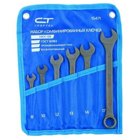 Kombinált csavarkulcsok Sibrtech 15471 CrV acélból, foszfátozott, GOST 16983, 6 db, 8-17 mm-es kötõelemek kicsavarására és csavarására tervezték, 6 oldalas vagy 12 oldalas fejprofillal. A gyûrûs torok belsõ felülete 12 arccal lehetõvé teszi, hogy a kulcso