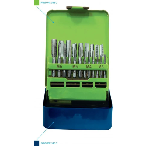 A készlet 15 elemet tartalmaz - menetfúrók (M3-M12), fúrók (2,5-10,2) és egy praktikus fémkazettát tartónak. A készlet mindent tartalmaz, ami szükséges az átmenõ és zsákfuratok létrehozásához, valamint az M3-tól M12-ig terjedõ átmérõjû belsõ menetek kézi