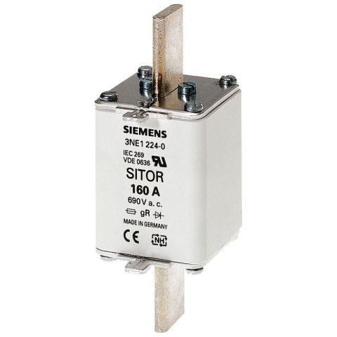 Siemens 3NE1227-2 késes biz., NH-1, 250A gR, 690VAC/250VDC, félvezetővédő SITOR biztosítékcsatlakozó, pengeérintkezőkkel\nA SITOR 3NE és 3NC félvezető biztosítékok védik az erősáramú félvezetőket a rövidzárlatok hatásaitól.\n\nMűszaki részletek:\n\n In