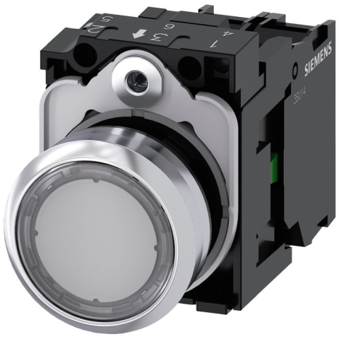 Siemens 3SU1156-0AB70-1BA0 komplett világító nyomógomb, átlátszó, 230VAC, 1NO, fém, csavaros Sirius Világító nyomógomb\nA Siemens SIRIUS ACT világító nyomógombja elektromos terhelések kapcsolására és szabályozására szolgál, kiemelkedő robusztussággal és e