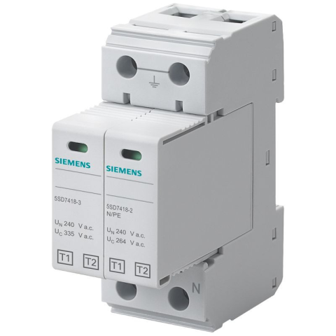 Siemens 5SD7412-2 túlfeszültség levezető, T1/B, 2P, 335V/264V, TNS/TT Villámhárító 1-es típus\nA Siemens túlfeszültség-védelmi készüléke hatékony védelmet nyújt az elektromos rendszerek túlfeszültsége ellen, villámcsapás és légköri hatások esetén.\n\nTech