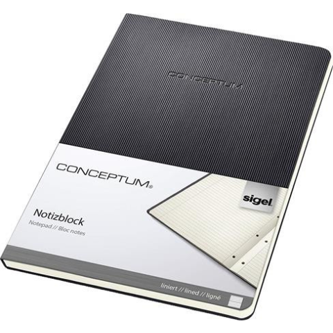 Füzet, exkluzív, A5, vonalas, 60 lap, keményfedeles, SIGEL Conceptum, fekete rugalmas, könnyen nyíló Softwave borítóval, kemény hátlappal, mely ideális támaszt nyújt írás közben tökéletes kötés és lyukasztott lapok a könnyed beillesztésért, belső zseb