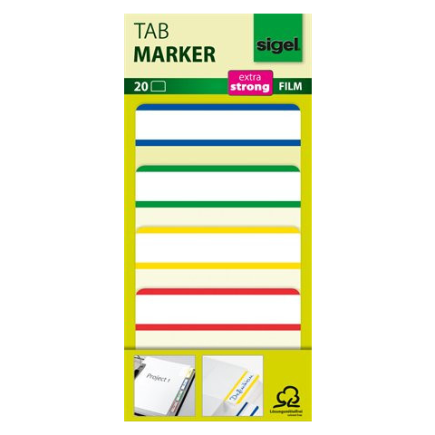 Jelölőcímke, megerősített, fehér szélű, 50x38 mm, 4x5 db, SIGEL, vegyes színek többrekeszes akták jelölésére elválasztólapok helyett kiválóan alkalmas színkódolásra írható PP anyag Gyártó/első EU forgalmazó elérhetősége: SIGEL GmbH Baeumenheimer Stra