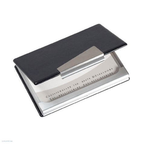 Elegáns alumínium/műbőr névjegytartó max. 20 db névjegy részére. 90x58 mm méretű kártyák tárolására. .