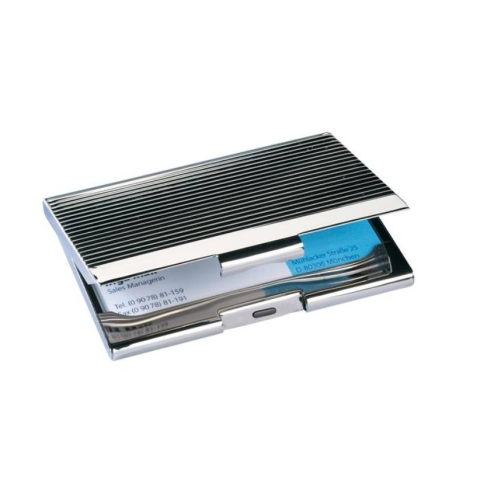 Névjegytartó tárca, fém, 20 db-os, SIGEL, ezüst (SVZ130) krómból készült fém tárca, ezüst színű, 20 db max. 91 x 56 mm méretű kártya tárolására Gyártó/első EU forgalmazó elérhetősége: SIGEL GmbH Baeumenheimer Strasse 10, 86690 Mertingen, Germany san