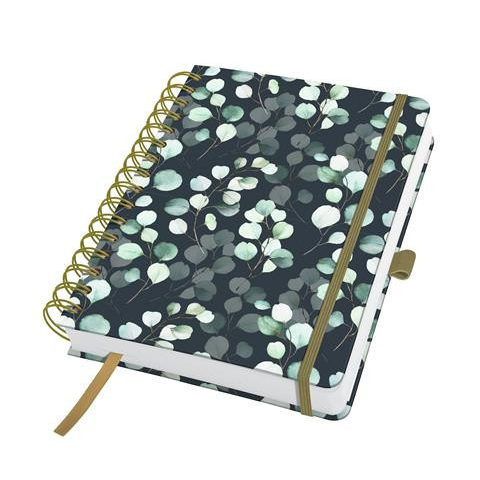Eukaliptusz motívumos keményfedeles spirálfüzet -matt motívum -zöld spirálkötés -mikroperforált lapok -240 pontrácsos oldal -120 grammos fehér papír -zseb a hátsó borítóján -70 %-ban FSC tanusítvánnyal rendelkező alapanyagból -vegán termék Gyártó/el