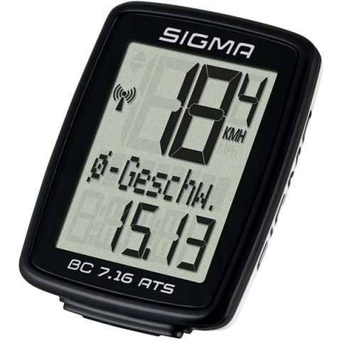 Kerékpáros computer - fordulatszámmérő, vezeték nélküli adatátvitel, sebesség érzékelővel, pillanatnyi sebesség, átlagsebesség, aktuális menetidő, megtett távolság, teljes menetidő és autostart/stop, 1,65" kijelző, 17532 óra maximális akkumulátor üzemidő, NFC és Bluetooth kapcsolat, mérete 50 × 39 × 12 mm (Ma×Sz×Mé), tömege 21 g, IPX7 védelmi fokozat, fekete színű tokkal, kerékpáros tartó is a csomag része A Sigma BC 7.16 ATS kerékpáros komputer az al
