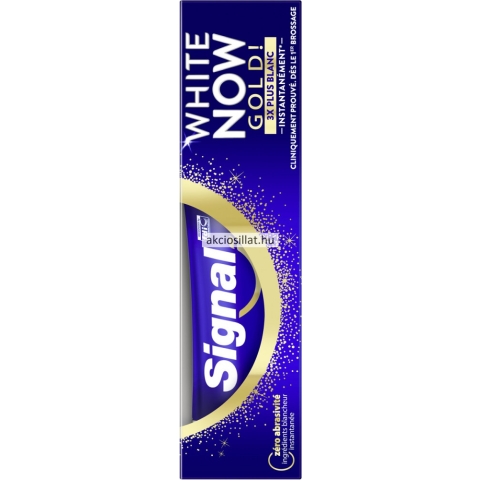 Signal White Now Gold fogkrém 75 ml – Ragyogó mosoly azonnal A Signal White Now Gold fogkrém innovatív formulája azonnali fehérítő hatást biztosít, köszönhetően a benne található kék és zafír pigmenteknek. Ezek a pigmentek optikailag világosítják a fogaka