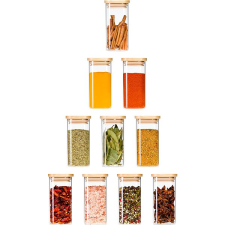 Fűszertartó szett - szögletes, boroszilikát üvegből készült, 500 °C-ig ellenálló, főleg száraz élelmiszerek és gyümölcsök tárolására, az üveg nem szívja magába a szagokat és a színeket, bambuszfedél szilikon tömítéssel, fagyasztóban használható, fedél nélkül sütőben és mikrohullámú sütőben, mosogatógépben mosható (a fedél kivételével), fal- és fenékvastagság 2 mm, térfogat 280 ml, méretek 12,5 × 6 × 6 cm, 10 db-os kiszerelés Siguro Bamboo