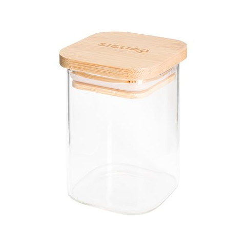 Tárolóedény - négyzet alakú, boroszilikát üvegből készült, 500 °C-ig ellenálló, főként száraz élelmiszerek és gyümölcsök tárolására tervezték, fűszertartókén is használható, az üveg nem szívja magába a szagokat és a színeket, bambusz fedél szilikon tömítéssel, fagyasztóban való használatra alkalmas, fedő nélkül a sütőben és a mikrohullámú sütőben, mosogatógépben mosható (a fedél kivételével), falvastagság és alsó vastagság 2 mm, térf