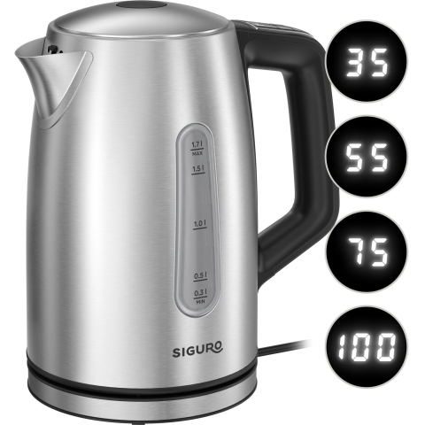 Vízforraló - 35–100 °C között szabályozható hőmérséklettel 5 °C-os lépésekben, űrtartalom 1,7 l, teljesítmény 2200 W, brit Strix csatlakozó több mint 12 000 használat élettartammal, 360°-ban elforgó talp kábeltárolóval, rozsdamentes acél anyag, melegen tartó funkció (akár 60 perc), fedélzár, automatikus kikapcsolás vízhiány és a beállított hőmérséklet elérése esetén, működésjelző fény, rejtett fűtőtekercs, antidrip fedél, hangjelzés, 70 cm-es