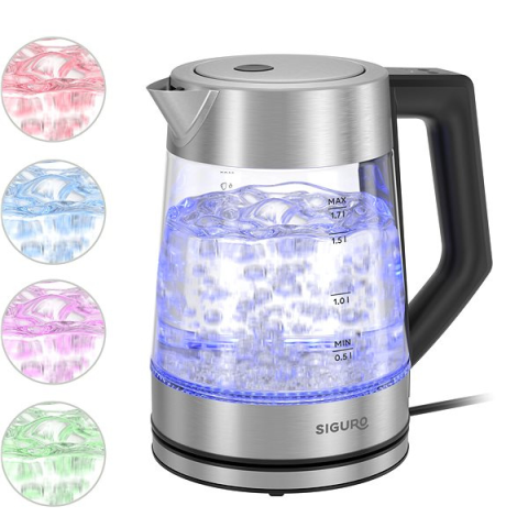 Vízforraló - hőmérséklet-szabályozás, 1,7 l térfogat, 2200 W energiafelhasználás, anyaga rozsdamentes acél és boroszilikát üveg, kivehető szűrő, 5 állítható vízhőmérséklet, 5 színű LED-es háttérvilágítás, automatikus kikapcsolás, működésjelző fény, hangjelzés, forgatható talapzat, Strix csatlakozó, integrált kábeltároló, kétoldalas vízszintjelző, kábel hossza 75 cm, 3 év garancia Siguro EK-S390GL Adelaide vízforralóA háttérvilágítással ell