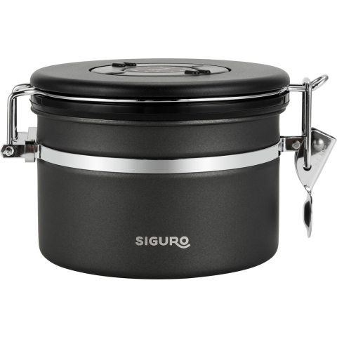 Tárolóedény - akár 300 g kávébabhoz, megvédi a kávét az UV-fénytől, nedvességtől és oxidációtól, minőségi rozsdamentes acél, ABS fedél szilikon tömítéssel és csatos zárral (BPA-mentes), egyirányú szelep, számláló a szavatosság beállításához, belseje csiszolt acél, külseje matt fekete felület Siguro Elite Brew kávétároló edényA Siguro Elite Brew kávétároló edénnyel a kávébabok mindig a legjobb formájukat hozzák. A tárolás során számos tény