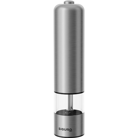 Fűszerdaráló - elektromos, borshoz vagy sóhoz, kerámia őrlőrendszer, állítható őrlési durvaság, praktikus világítás, könnyű, egykezes használat, 60 ml űrtartalmú tartály, anyaga: rozsdamentes acél matt felületkezeléssel és ABS műanyag, tápellátás: 4× AA elem (nem tartozék), méretek: 223 × 52 × 52 mm, tömege: 293 g Siguro Essential bors- vagy sóőrlőA stílusos Siguro Essential elektromos bors- vagy sóőrlőnek minden konyhában ott a helye. És nem csak a g