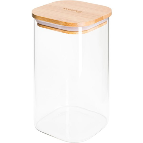 Tárolóedény - négyzet alakú, boroszilikát üvegből készült, 500 °C-ig ellenálló, főként száraz élelmiszerek és gyümölcsök tárolására való, az üveg nem szívja magába a szagokat és a színeket, bambusz fedél szilikon tömítéssel, fedővel fagyasztóban, fedő nélkül sütőben és mikrohullámú sütőben is használható, mosogatógépben mosható (a fedél kivételével), falvastagság és alsó vastagság 2 mm, térfogat 1400 ml, méretek 19 × 10 × 10 cm Siguro