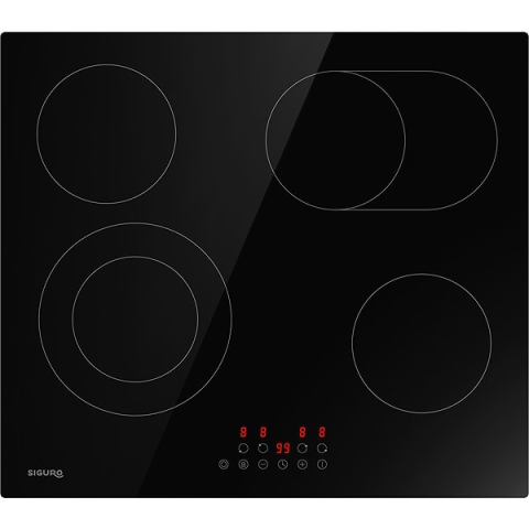 Főzőlap - üvegkerámia, beépíthető, 4 főzőzóna, duális és ovális zóna, automatikus kikapcsolás, zárolható vezérlőpanel, maradékhő-kijelző, túlmelegedés elleni védelem, egymástól függetlenül programozható főzőzónák, hangjelzés, időzítő (akár 99 perc), érintővezérlés, egyenes élek, fekete üveg, kaparó a csomagban, energiafelhasználás 6 600 W, csatlakoztatás 230 V és 400 V, méretek 59 × 52 × 5 cm (Szé×Mé×Ma), a készülék csatlakoztatásához