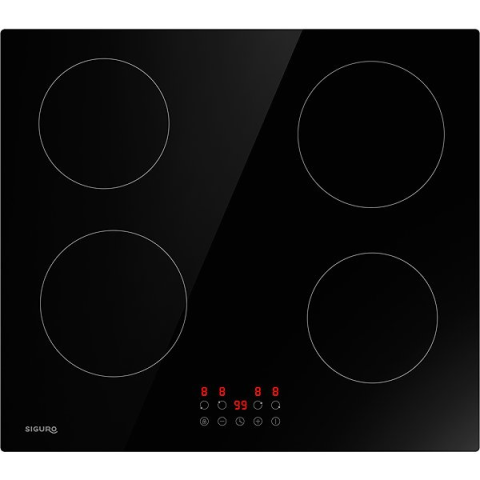 Főzőlap - indukciós, beépíthető, 4 főzőzóna, edényfelismerés, automatikus kikapcsolás, zárolható vezérlőpanel, maradékhő-kijelzés, folyamatos és egyenletes melegítés, egymástól függetlenül programozható főzőzónák, hangjelzés, időzítő (akár 99 perc), érintésvezérlés, egyenes élek, fekete üveg, kaparó a csomagban, energiafelhasználás 6 000 W, csatlakozás 230 V és 400 V, méretek 59 × 52 × 6,3 cm (Szé×Mé×Ma), a készülék beszereléséhez villan