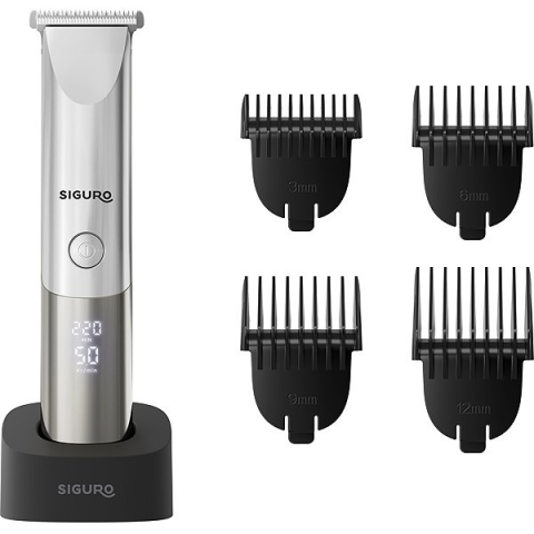 Trimmelő - hajra és szakállra, testre, férfiaknak, 2 sebesség, 5 vágási hossz (1–12 mm), 4 felpattintható tartozék, rozsdamentes acélpenge, vízállóság (IPX7), kijelző, üzemidő akár 220 perc, könnyített és ergonomikus design, egyszerű tisztítás, töltőállvány, kenőolaj, tisztítókefe, töltőkábel (1 m), utazótáska, tömeg 193 g, garancia 3 év Siguro HR-T380S EasyTrim 5in1 trimmelőA Siguro HR-T380S EasyTrim trimmelővel nem lesz szükséged sok eszközre - mive