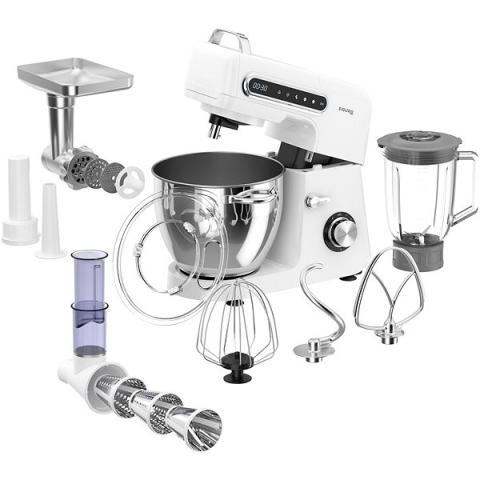 Konyhai robotgép - teljesen fém, bolygómozgás, teljesítmény 1800 W, teljesen fém fogaskerekek, edény rozsdamentes acél fogantyúkkal, űrtartalom 6 l, 8 sebesség, digitális kijelző, időzítő, PULSE gomb, biztonsági biztosíték, habverés, dagasztás, keverés, húsdarálás, reszelés, fedél mellékelve, keverő, dagasztóhorog, habverő, mixer, húsdaráló és reszelő, max. zajszint 75 dB, kábelhossz 1 m, súly 8,2 kg, méretek 37 × 40 × 23,5 cm (Ma×Szé×Mé), fehér sz