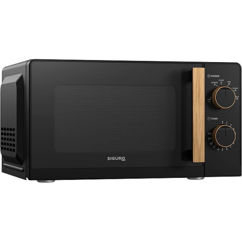 Mikrohullámú sütő - szabadon álló, kompakt, térfogat: 17 l, tányér mérete: 24,5 cm, bemeneti teljesítmény: 1 100 W, mikrohullámú fűtőteljesítmény: 700 W, 6 leolvasztási teljesítményszint, 30 perces időzítő, egyszerű kézi működtetés, üvegajtó, a tápkábel hossza: 108 cm, külső méretek: 24,3 × 44,6 × 36,2 cm (Ma×Sz×Mé) belső méretek 20,2 × 29,8 × 30,9 cm (Ma×Sz×Mé), fekete színben, 3 év garancia Siguro Wood M171B mikrohullámú sütőA Siguro Wood M