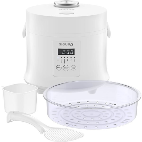 Rizsfőző - 0,6 l-es űrtartalom, max. 450 g nyers rizs megfőzésére alkalmas, 4 tagú család számára ideális, digitális kijelző, tapadásmentes felületű alumínium edény, 6 program, melegen tartás funkcióval (akár 24 óra), automatikus kikapcsolás 24 óra után, a csomagban: rizskanál, mérőedény, gőzölőkosár, kompakt méretek: 21 × 22 × 21 cm, tömeg: 1,8 kg, kábel hossza: 1,2 m, 3 év garancia Siguro RC-R301W Rice Master Digital rizsfőzőSzerezd be a Siguro RC-R301W