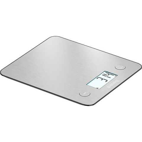 Konyhai mérleg - teherbírás 5 kg-ig, pontosság 1 g, g, ml, lb, oz egységek kiválasztása, automatikus és kézi leállítás, TARE funkció a tartály súlyának leolvasásához és a méréshez, nyersanyagmérési és térfogatmérési funkciók, túlterhelés és alacsony töltöttségi szint jelzése, rozsdamentes acél mérőfelület, háttérvilágítású kijelző, tápegység 3× AAA elem (tartozék), méretek 21,7 × 18,7 × 1,8 cm, 3 év garancia Siguro SC-N640SU okos konyhai mér