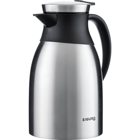 Termosz és termokonténer, térfogat 1500ml, hideg ital hőállósága 24 óra, forró ital hőállósága 12 óra, vákuum a két fal között a nagyobb hőállóság érdekében, mosogatógépben mosható, belső és külső fal nem mérgező rozsdamentes acélból, csavaros kupak karos mechanizmussal, alsó felület csúszásgátló bevonattal, tömeg 707g, 3 év garancia Siguro TH-K35 Vacu-jug termokancsóÉlvezd a forró teát vagy kávét bármikor a nap folyamán - otthon vagy a munkába