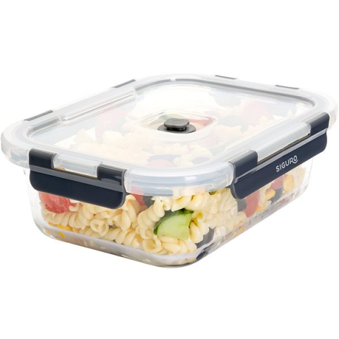 Tárolóedény - téglalap alakú, boroszilikát üvegből készült, sütőedényként is használható, 500 °C-ig ellenálló, az élelmiszerek megőrzésére és eltarthatósági idejének meghosszabbítására tervezték, az üveg nem szívja magába a szagokat és a színeket, légmentes fedél szilikon tömítéssel és szeleppel, fedővel a fagyasztóban való használathoz, fedő nélkül a sütőben és a mikrohullámú sütőben, az üvegtartály mosogatógépben mosható, falvastags