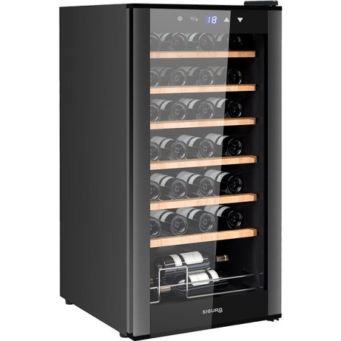 Borhűtő - G energiaosztályú, 28 palack számára, belső térfogata 74 l, 1 hűtőzónával, 6 polcos, figyelmeztető jelzés hiba esetén, nyitott ajtó riasztás és gyerekzár, kijelző és megvilágítás, érintőképernyős vezérlés, 5-18 °C között szabályozható hőmérséklet, 39 dB zajszinttel, jobbos nyitásirány, mérete 84 × 43 × 45 cm (Ma×Sz×Mé), tömege 25,5 kg, fekete színű Siguro WC-G282B Wine Cellar borhűtőNe kövess el a bor tárolásánál hibát, és szere