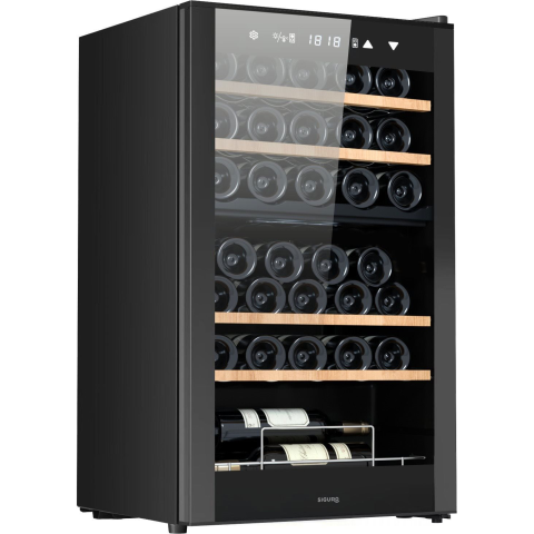 Borhűtő - G energiaosztály, szabadon álló kompresszorral, 33 palack számára 2 zónában 15 és 18 palackkal, a hőmérséklet beállítása zónánként függetlenül 5-18°C, összesen 5 polc, fából készült díszítéssel és alsó tárolóhellyel, polcmélység 33 cm, térfogat 88 l, kék LED kijelző, LED világítás, C zajosztály, fekete színű, Méretek 84,8 × 49,5 × 43 cm (Magasság×Szélesség×Mélység), tömege 27 kg, a tápkábel hossza 170 cm, 3 év garancia Siguro W