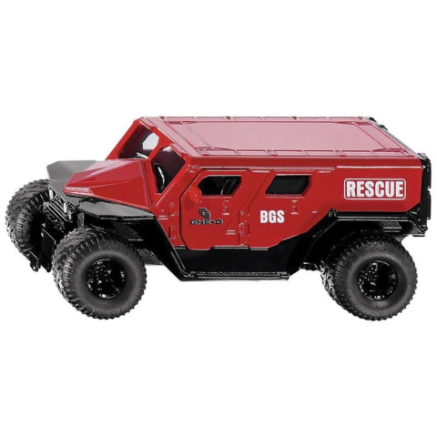 Ennek a mentőautónak nincs szüksége sem szirénára, sem jelzőlámpára. A nagy V8-as motorral hajtott, futurisztikus stílusú monster truck GHE-O Rescue utat tör magának. A rugózott első és hátsó tengelyekkel, valamint a nagy abroncsokkal durva terepen is ideális a haladása. A gumik is levehetők. Az 150-es méretarányú modell első és hátsó ajtaja nyitható, így a mentőhord