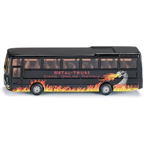 Szállíts zenekarokat a MAN turnébusszal A SIKU MAN turnébusz 187 - 1624 fémből és műanyagból készült fekete turistabusz, Metal Tours felirattal. A busz oldalát lángok díszítik, a jármű megjelenése exkluzív. A SIKU MAN turnébusz együtt használható más 187 méretarányú SIKU autókkal és készletekkel is. Csomagolás méretei 20 x 3 x 8 cm.