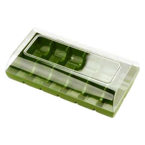 Macaron doboz, zöld, műanyag, 12 db A Macaron doboz egy praktikus, ellenálló és funkcionális műanyag doboz a macaronok számára. 2 méretben kapható: 6 vagy 12 macaron számára. Egy átlátszó fedélből és egy 8 színben kapható tálcából áll. A fedél stabil i