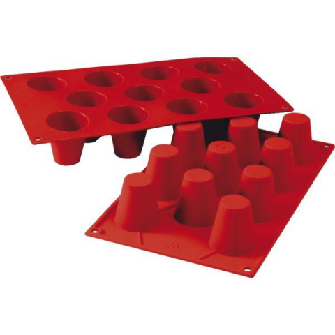 Piros Silikomart dariol szilikon forma 11 darabhoz. A lyukak 0,05 l űrtartalmúak és átmérőjük 4,5 cm. A forma ideális kis tortácskák, mini kuglófok és egyéb desszertek elkészítéséhez.