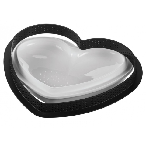 Silikomart tarte forma, szív szilikonformával A hagyományos torta új design kap a Silikomart Professional által készített Kit Tarte Ring Amore-nak köszönhetően. A készlet két elemből áll: egy 205 x 190 h 20 mm-es gyűrűből, amely alkalmas az alap elkész