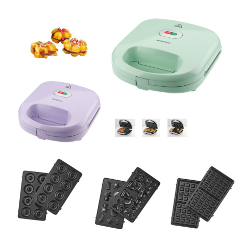 Multifunkciós, 750W-os gofrisütő, kivehető, cserélhető sütőlapokkal. Klasszikus gofrit, mintás gofrit és közepén lyukas minifánkot is süthetünk vele! - A készlet erejéig lila vagy zöld készülékházzal - Recept ötletek és magyar nyelvű leírás - 750W teljes