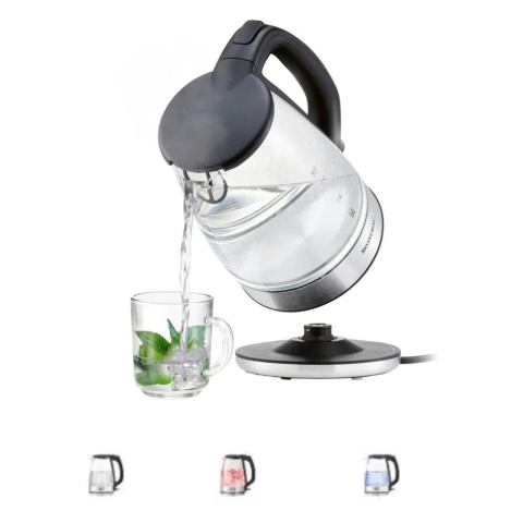 - Üveg vízforraló háttérvilágítással - Használható térfogat: kb. 1,7 liter - Anyag: rozsdamentes acél, műanyag - Teljesítmény: 3000 W - A LED világítás színe a hőmérséklet emelkedésével változik - 1 l vizet kb. 2:38 perc alatt forral fel - Fedél praktikus
